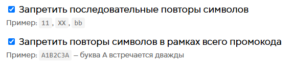 Также можно настроить запрет повторения символов, можно запретить последовательное повторение символов в промокоде, а также повторение символов в рамках всего промокода.