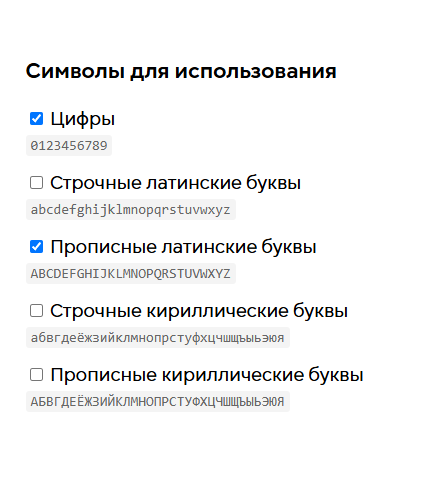 В разделе настроек "Символы для использования" можно укать символы которые будут использоватся для генерации промокода.