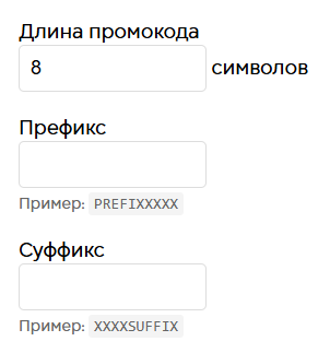 В разделе настроек "Настройки генерации" можно указать длину промокода, а также префикс (приписка в начале промокода) и суффикс (приписка после).